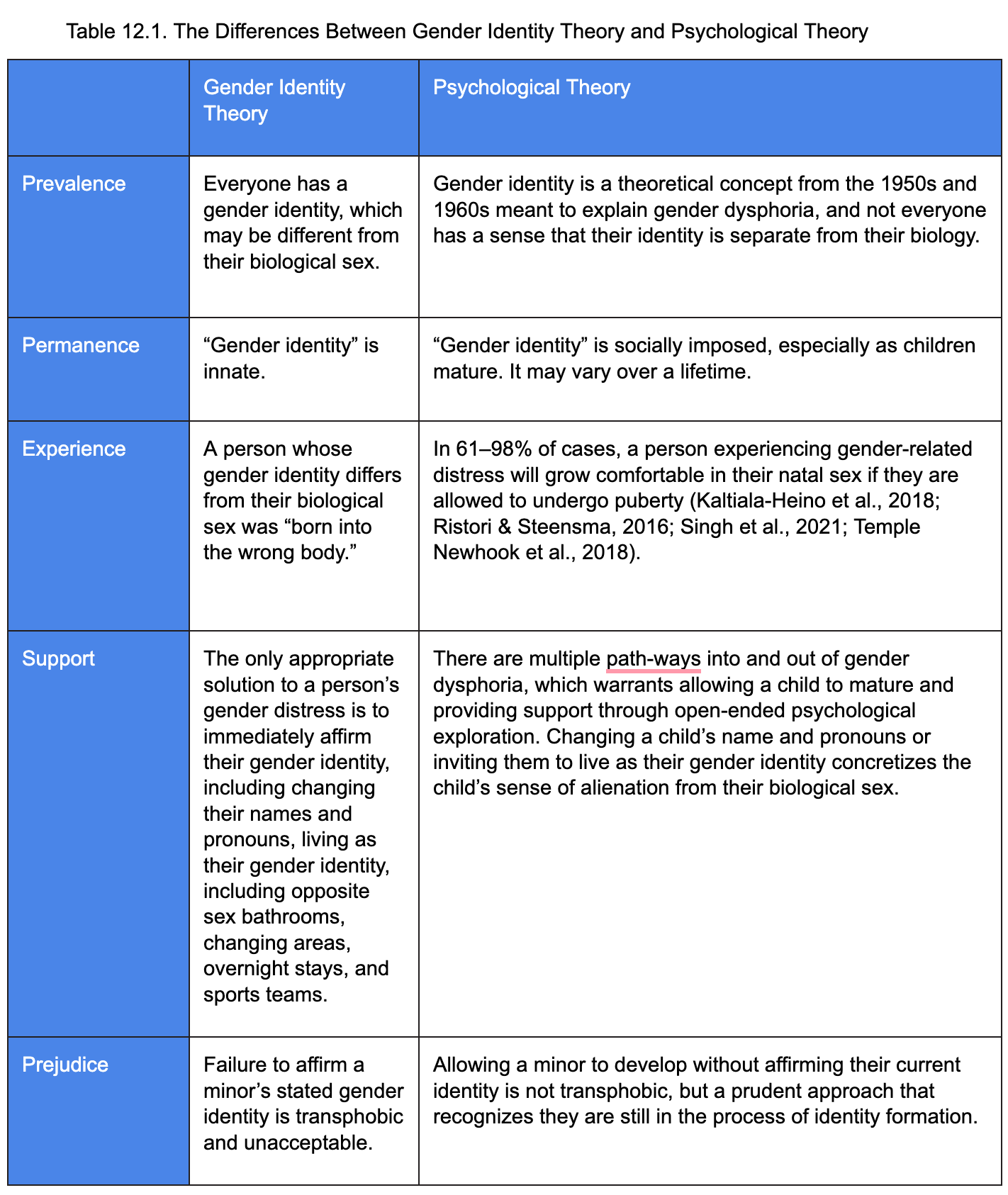 The differences between gender identity theory and the psychological theory are outlined in Table 12.1.