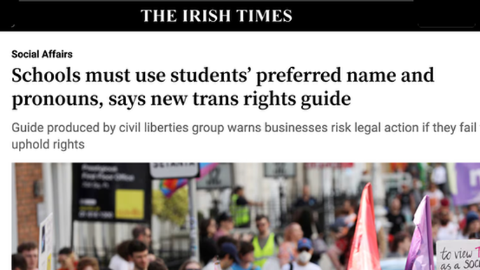 On January 16th, The Irish Times published a front-page article under the headline: “Watchdog says schools must use students’ preferred pronouns”. The report outlined the contents of a “rights guide” for people who identify as trans and non-binary published by the Irish Council for Civil Liberties (ICCL). The headline got two important things wrong. The ICCL is not a watchdog. It has no regulatory power to direct, discipline, or compel anyone to do anything. And more importantly, there is no legislation or case law in Ireland requiring anyone to use “preferred pronouns” in any setting.
